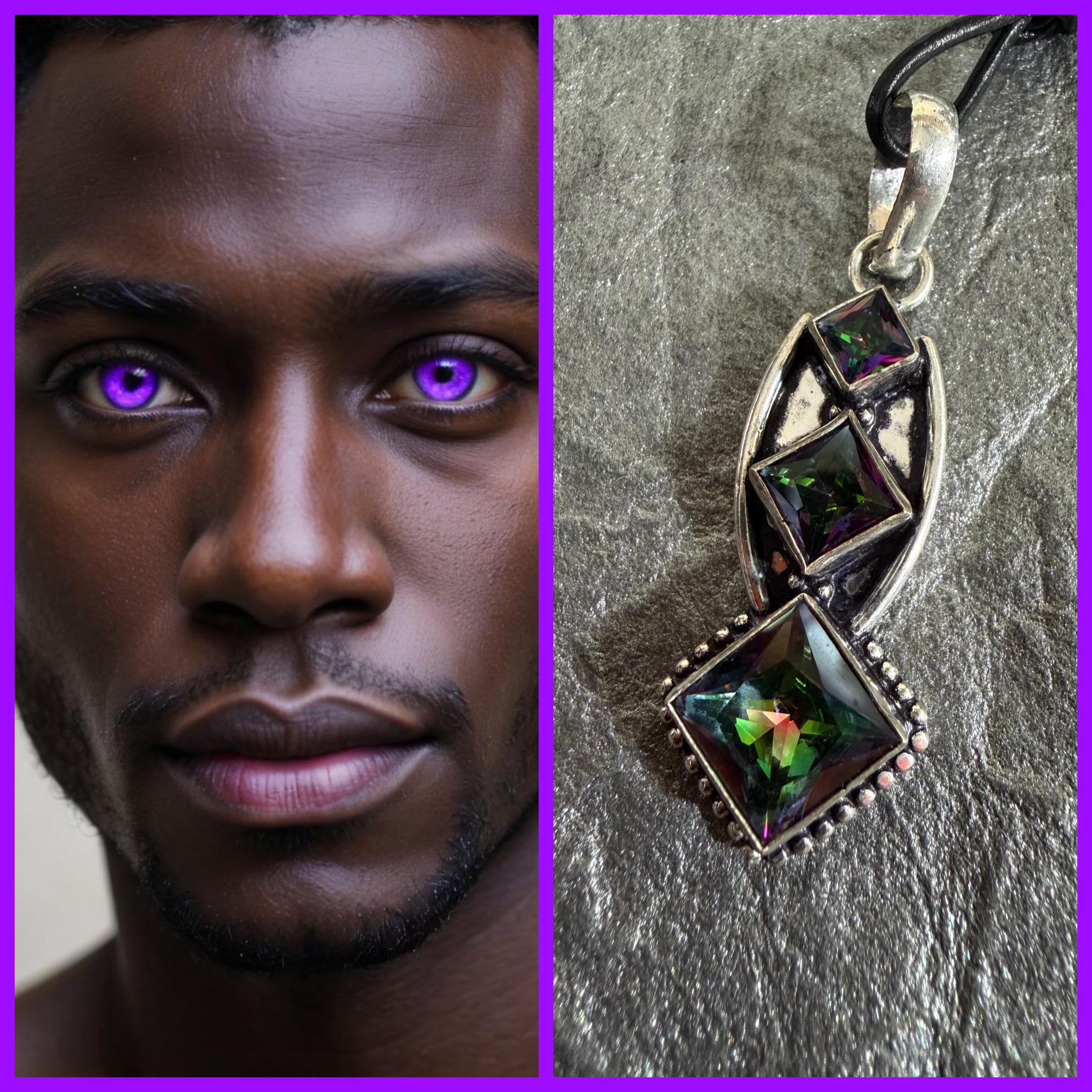 Appearance: muscular dark-skinned man with pink/violet eyes